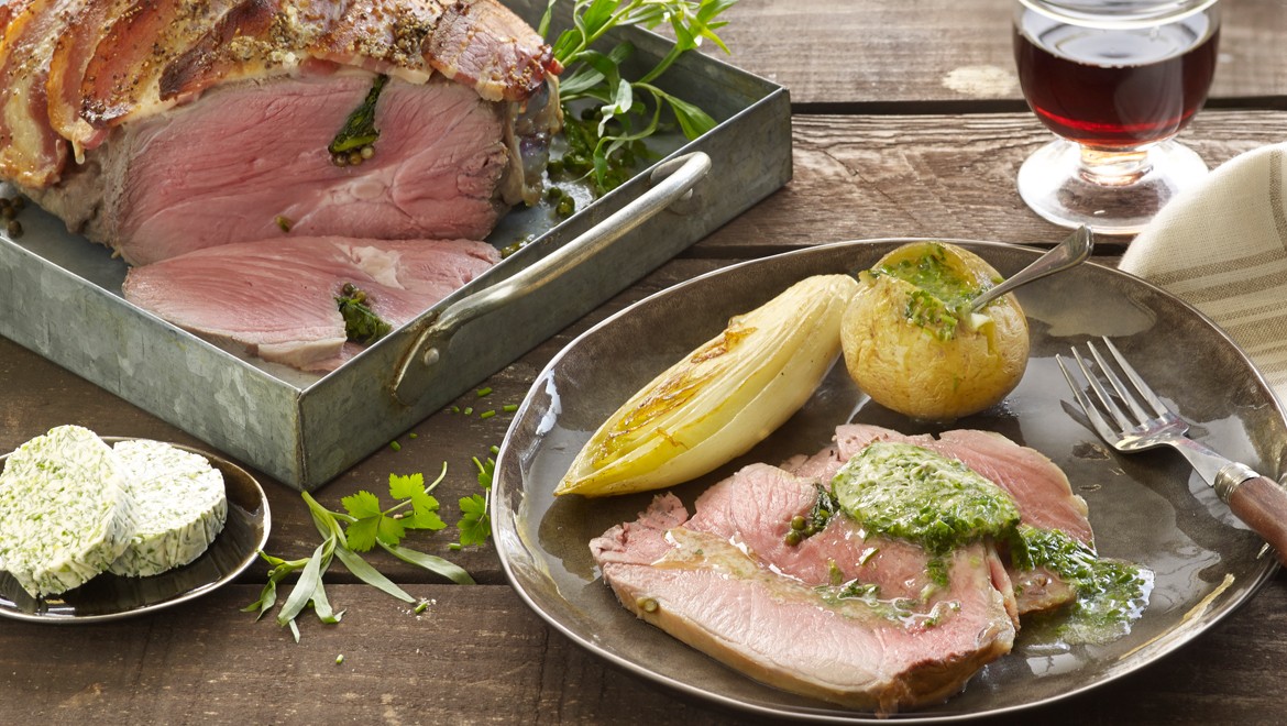 Het vlees mag nog mooie roze zijn en dit dan in dikke plakken verdelen op een bord met een flink stuk kruidenboter erop.